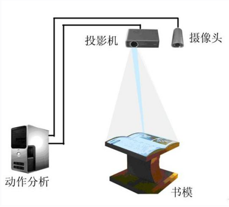 投影機(jī)將畫面投射到一本書的模型上,觀眾能看到一本書打開的樣子。通過兩個(gè)按鈕,觀眾可以選擇書的內(nèi)容,書的內(nèi)容及時(shí)通過投影機(jī)投射出來,觀眾站在書模型前做揮手動(dòng)作時(shí),翻書感應(yīng)器檢測(cè)出揮手的方向,計(jì)算機(jī)立即控制圖書翻頁,既可以向前翻也可以后翻,翻頁的同時(shí)可伴隨音效。
