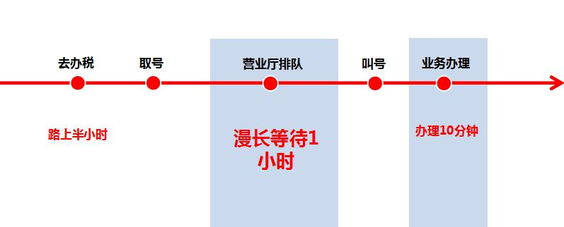 3、去辦事大廳辦理業(yè)務(wù),花半小時(shí)到達(dá)辦事大廳,取號(hào),再等30-60分鐘甚至兩個(gè)小時(shí)時(shí)間,最后花10-15分鐘甚至更少時(shí)間用于實(shí)際辦業(yè)務(wù);