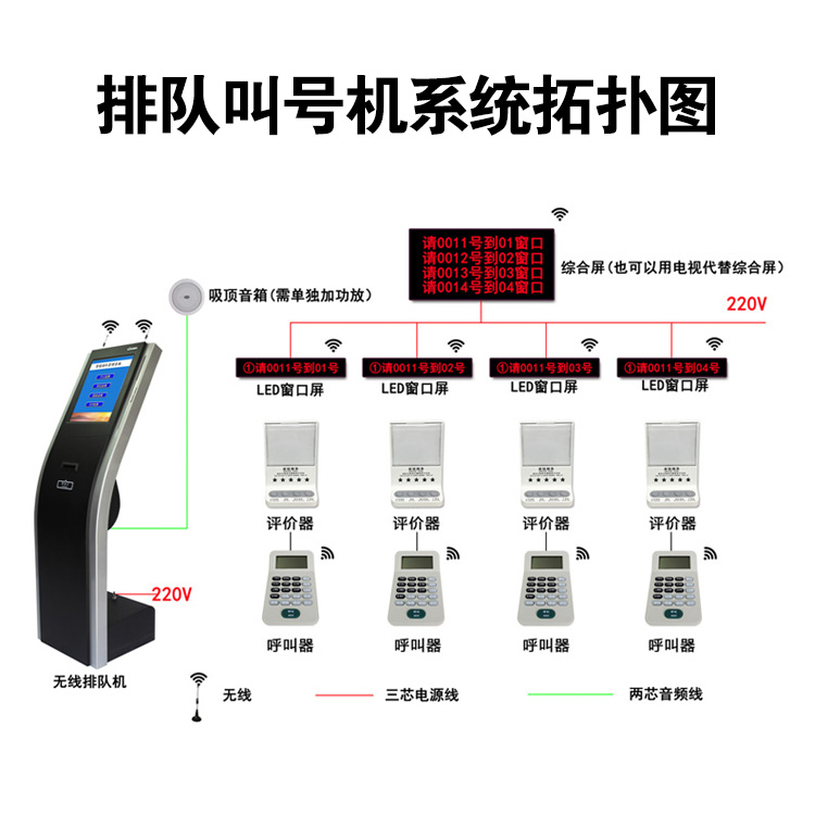 2、每個窗口的呼叫器通過內(nèi)置無線接收器與排隊機進行數(shù)據(jù)通信,評價器通過音頻口直連呼叫器與排隊機進行數(shù)據(jù)通信;